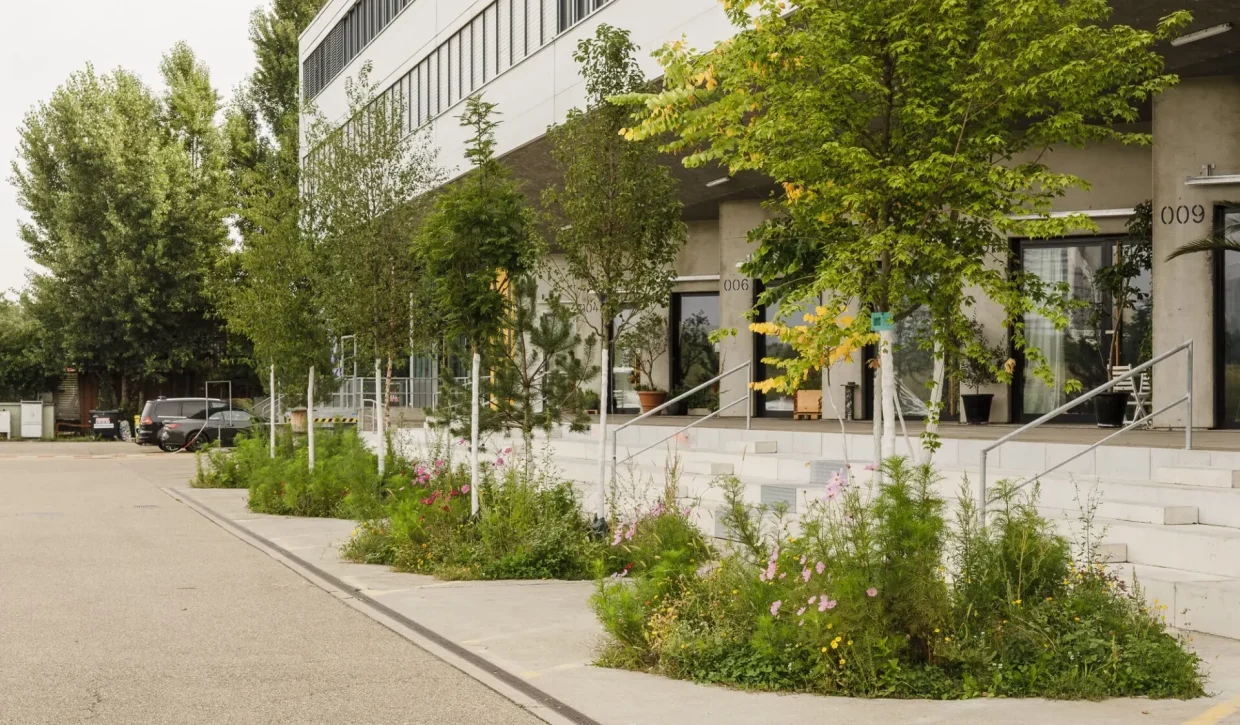 Stadtbegrünung kann einfach umgesetzt werden. Wir identifizieren POPS (Privately Owned Public Spaces) und machen Vorschläge aus eigener Initiative. Wir begeistern Eigentümer:innen mit der Idee ihren Aussenraum durch Baumpflanzungen aufzuwerten. Die Uferstrasse 70 und und der Aussenraum bei HdM beweisen: Gute Transformation kann schnell, einfach und wirksam sein.